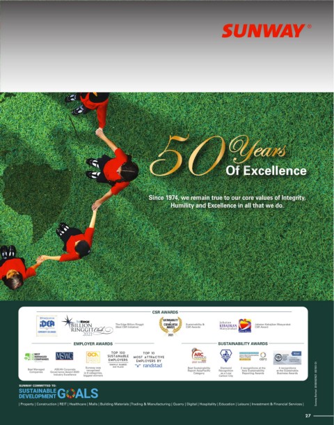 Since 1974, we remain true to our core values of Integrity, Humility and Excellence in all that we do. SUNWAY COMMITTED TO: 26 27